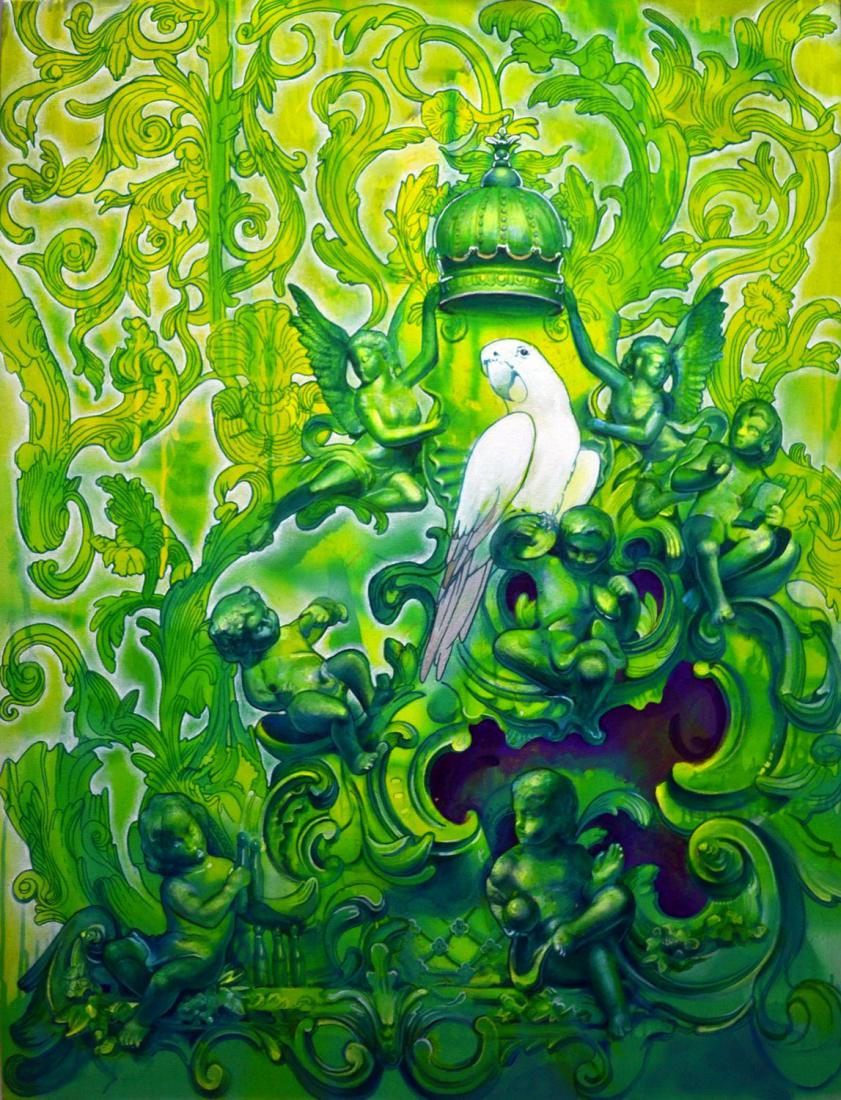 《穿梭在时光里》 李易君 油画 布面丙烯 90cmx110cm 2014年 在李易君的作品中,他习惯将一些现实生活中具体的物象组合打乱,进行重新组合,形成新的构图,使得画面具有一种梦幻般的超现实主义特征。在《离》系列作品中,出现了一些玩具、水晶灯、动物、植物等具象的物体,但不可思议的是,他将这些物体以一种令人眼前一亮的方式组合在一个画面中。画面通过他精心的构思和梦幻般的色彩运用,呈现出一种意想不到的效果。艺术家通过这种超现实的手法想要传达的是一些对于生活的感悟,观者通过另一种视角来观看那些在现实生活中已经习以为常的事物,或许会有新的发现。