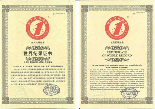老有所为:2000老人共同创造世界纪录 世界记录证书内容如下:2016年4月19日,中国老龄事业发展基金会、沈阳市绿化委员会办公室、沈阳市林业局、沈阳市皇姑区夕阳红为老服务中心、康平县林业局主办,夕阳红为老服务项目管理委员会、安然华旗善文仲德系统承办的第二届“绿化祖国,低碳行动”——2016“认建、认养”大型公益植树活动,在沈阳市康平县孙家店国营林场举行,共有2000名老年人参加公益植树,共植树30000棵,创世界纪录协会“世界上最多老年人同时公益植树”世界纪录。