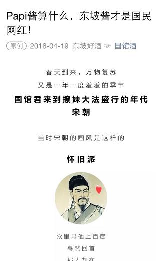 根据笔者统计,国馆号平均每周都会有3-4篇10万加的内容,平均阅读量达到8万级别。这对于一个企业公众号来说,这是一个不可思议的数据。 变革内容,传统文化与互联网跨界碰撞新火花 24小时阅读量破100万,48小时阅读量达到千万级别。这些数据来自国馆酒2015年的一篇广告软文——《你饿不饿,朕给你讲个段子》。以卖萌的方式讲述严肃的帝皇历史,打造出一个白酒行业中绝无仅有的经典案例。随后,承接着这场由自己掀起的风潮,国馆陆续推出《买到假货,朕怒了》和《Papi酱算什么,东坡酱才是国民网红》等爆文,将古代红人与自身捆绑在一起,令古人为品牌“代言”。