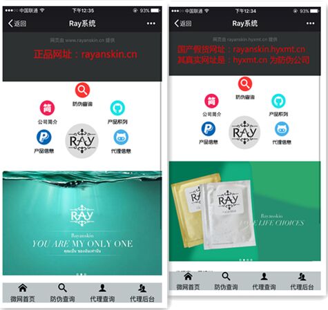 近期国内面膜市场出现了一股泰国热,其中泰国RAY芮一面膜在中国很是火爆。 但是泰国面膜RAY在国内众多代理中出现了奇怪的现象,有一部分2014年做微商的团队,将原来本来没有防伪的RAY面膜在国内加上防伪,说自己产品为正品,在国内加工生产,通过团队所有代理宣传带防伪的为正品,其实防伪都是自己加上去的... 一、我们来看看扫描防伪码进去域名为rayanskin.hyxmt.cn。专业人员一看就知道这个是二级域名,把前面的rayanskin去掉,进去的hyxmt.cn才是其真正的网址,却是广东鸿什么防伪公司的,而正品的网址是一级网址rayanskin.cn,这个才是RAY面膜官方防伪查询,看下面的图片