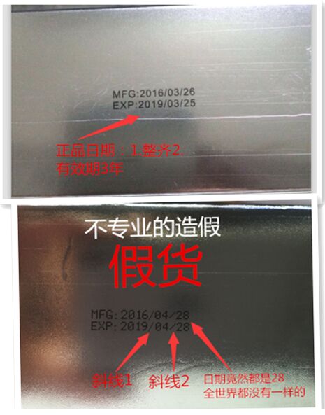 三、最关键的就是生产日期;正常的生产日期都是三年,国际上都是到三年后的前一天,而可笑的造假者连这点常识都不懂,,,直接三年后的同样日期,,,好可笑 好可笑啊...再看看印刷的字体,斜线..我去 竟然出现了两条线不一样,简直匪夷所思,设计者你急着去吃翔么,,,痛恨那些造假者...快看看你自己的货是什么样子的吧.....