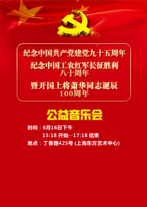 由中共一大会址纪念馆主办,星夜钢琴(控股)集团、上海企星文化(传媒)有限公司、上海畅辉文化传媒有限公司承办的《纪念中国共产党建党九十五年、纪念中国红军长征胜利八十周年暨开国上将萧华同志诞辰100周年大型公益音乐会》将于2016年6月16日下午15点18分,在丁香路425号上海东方艺术中心隆重举行。同时KK直播将对这项具有重大革命意义的活动进行全程网络直播(直播房间:105255351)。