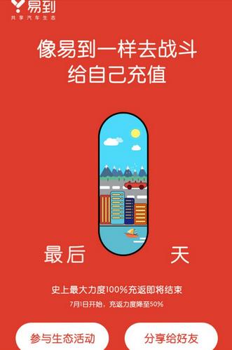 2015年10月,滴滴、Uber在中国专车市场争夺激烈之时,正经历低谷的易到用车获得了乐视7亿美金的入股。三个月后,乐视董事长贾跃亭在年会上为易到定下2016年“100万日订单、100万车源、100万司机”三个百万目标。 易到这个开创中国互联网专车市场的老大哥,加入乐视生态世界后,在生态效应下果然彰显了惊人的实力,通过已经持续大半年的“充值返现”活动,以及不断升级的生态营销方式,再加上易到的优良基因,使得订单暴增,司机蜂拥而来,仅仅几个月的时间就实现大逆转,重新奠定了行业格局。 100%充值返现仅剩1天 易到这场旷日持久的充返活动让众多用户重回易到,这也是让易到重新杀回市场重要的转折点:老用户单笔充值100-6999元,均100%返现;单笔充值7000元-11999元,可获得100%返现和乐2手机一部;单笔充值12000元及以上,可获得100%返现和乐视电视超X40S一台。新用户充值可享更大优惠,单笔充值100-199元,享受100%返现+50元优惠券;单笔充值200-299元,享受100%返现+100元优惠券。以此类推,单笔充值最多能获得500元的优惠券。单笔充满7000或12000元,可以获得乐2手机一部或乐视电视超X40S一台。 随着易到活动逐渐升级,营销方式更加的多样化,易到每推出一个活动都变成了新老用户的狂欢。不管是易到的100%充值返现活动还是硬件免费日、会员生态日,无不紧密贴合“互联网+交通”的理念,一方面让更多用户在低门槛感受和体验易到高标准的服务,享受“质优价平”的美好出行,另一方面也将巩固客户群体、巩固司机群体,在用户中的口碑都非常好。 现在,这场浩大的100%充返活动在6月30日正式结束,从7月1日开始,易到将全面开启生态充返。