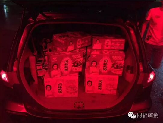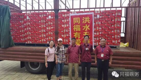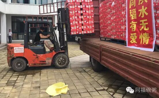 物资到达现场 7月4日早,同福公司与民政部门主动联系,了解目前受灾情况,并送往同福碗粥保证受灾群众饮食。