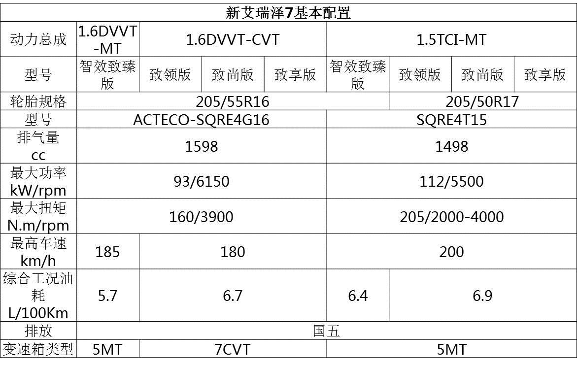 新艾瑞泽7的长宽高和轴距与艾瑞泽7e相同,搭载了1.6DVVT和1.5T两款发动机,搭配 5MT以及CVT无极变速箱,拥有多款配置组合。