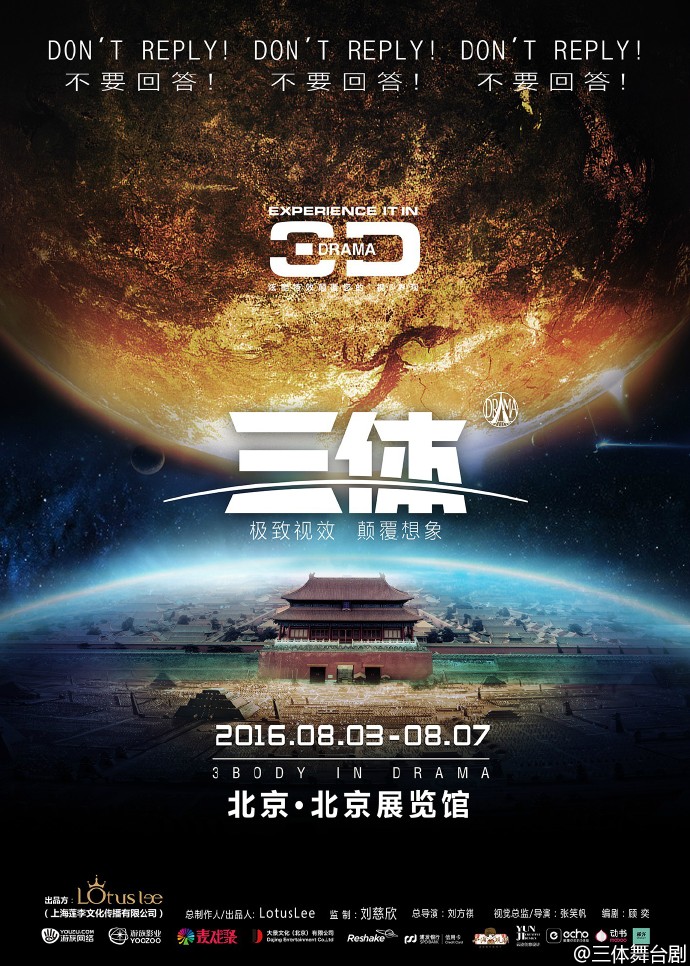今年6月,《三体》舞台剧在上海文化广场进行了首演,以每场95%以上的上座率成为了今年的票房冠军。2016年8月3日--7日,北京展览馆剧场迎来三体文明,北京将作为巡演首站,给京城观众带来一场视听盛宴。两个文明为了生存展开的智力博弈,如何用舞台艺术将其呈现,是这场盛宴中最令人期待的部分。