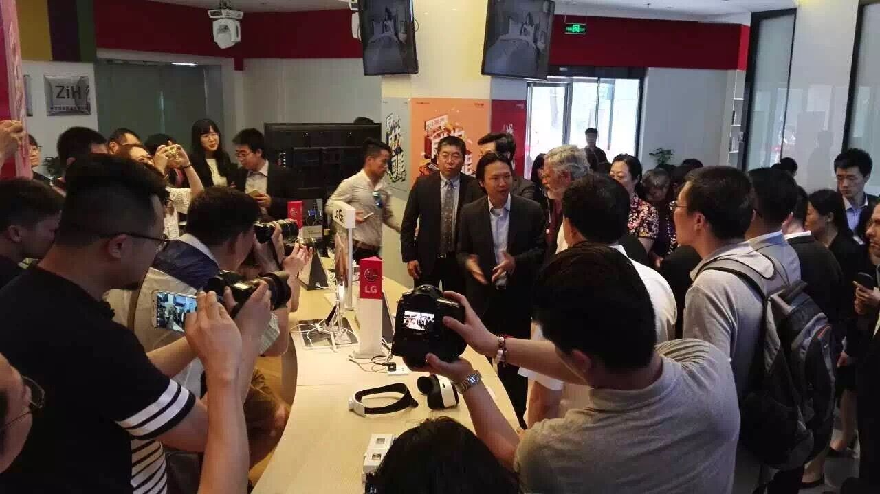 第一排 左三国家科技部长万钢 左二白宫大使霍尔德伦博士 左一李开复 参观团一行来到京东奶茶馆北京中关村店