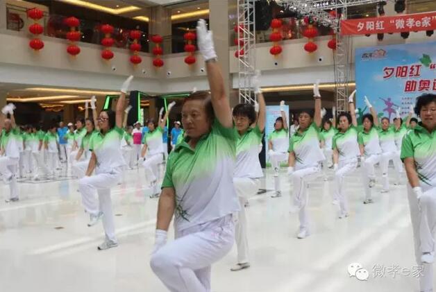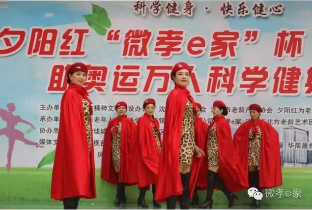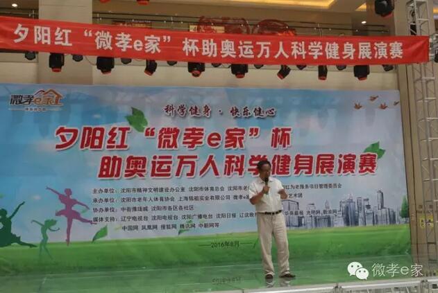 “科学健身 快乐健心”夕阳红“微孝e家”助奥运万人科学健身展演赛即于8月10日在中街豫珑城举行,为期3周。此次大赛由沈阳市精神文明建设办公室、沈阳市体育总会、沈阳市老龄产业协会、夕阳红为老服务项目管理委员会主办,沈阳市老年人体育协会、上海铭祖实业有限公司、微孝e家、沈阳市北方老龄艺术团承办,中街豫珑城、沈阳市各区各社区协办。还得到海尔、金龙鱼、中粮、爱康国宾、中农科、井泉、老兵等的友情赞助支持,e起给中老年人提供健康生活。当天到场的队伍有25个,主要包括大东、浑南、沈北新区等。最终大东爱心舞蹈队的《中国美》以8.24分获得"日冠军"。