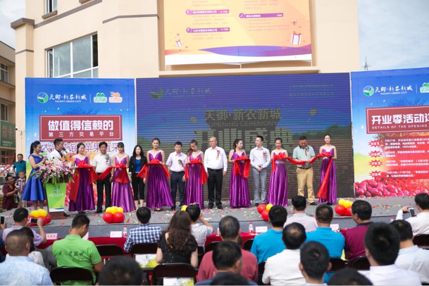 9:00许,伴随着16门礼炮的齐鸣,栖霞天御·新农新城开业剪彩仪式正式开始,见证本次剪彩仪式的有:栖霞市副市长鲁明义、杨础镇党委书记史大琛、镇长贺雪刚等一行领导、栖霞市农商行李志明副行长等一行领导、栖霞市电视台、以及来自上海、江苏等华东区域和陕西等西北区域的农商代表,冷库及合作社代表,入驻天御·新农新城的农资厂家代表及天御·新农新城的合伙人代表和栖霞市各村镇的上千名果农,场面浩大,一时间人头攒动,好不热闹!