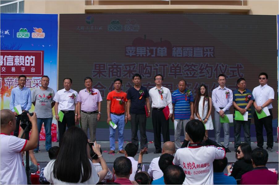 上海天御科技集团有限公司项目管理中心总监、烟台天御农业科技有限公司总经理倪俊先生发表重要致辞,不但将集团的泛农业发展概况做了详实的介绍,更从公司未来的战略布局层面谈到了新农新城建设的战略性意义。对此,杨础镇党委书记史大琛和栖霞市农商银行李志明副行长也在典礼祝词中对天御·新农新城表示了大力的支持;我国龙头国企光明食品(集团)有限公司旗下上海星辉蔬菜有限公司作为农商代表、深圳诺普信农化股份有限公司旗下烟台顺泰植保科技有限公司作为农资厂家代表以及新农新城村级合伙人代表也都看好天御·新农新城的前景,表示了愿意长期合作的意向。 优质苹果采购商扎堆签约,超十二万吨苹果订单实现栖霞直采;与此同时,天御科技与栖霞市农商银行达成战略合作,从金融信贷角度解决果农痛点