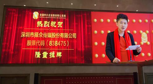 (择众传媒董事长石亮、总经理黎路推开新三板大门) 石亮最后表示,本次成功挂牌,是对择众传媒多年来创业经营的肯定,也是择众传媒发展史上的一个重要里程碑。在过去的三年里,择众营业收入复合增长率超过200%。对比各项运营数据,择众传媒已经具备了进入新三板创新层的条件,将为成为优秀的新三板科技创新企业而努力。