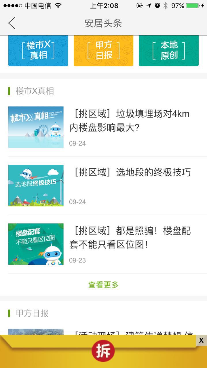 比如,用户处于准备买房阶段,打开智能买房助手,可以了解最新的购房政策,或是查询自己是否限购,置换需求的购房者还可以为房子估价,了解自己的购房能力;而在看房选房阶段,用户可以查看到“如何选户型”、“如何选楼层”等实用信息,还可以体验安居客APP上的“一键找房”;而如果用户到了购房贷款的阶段,公积金查询、房贷计算器、贷款知识等都会在智能买房助手中呈现。 这种模块化的形式,最大程度降低寻找信息服务的时间成本,让购房用户不再迷茫。值得一提的是,智能买房助手中的内容除了区分购房周期,也区分城市,贴近用户最真实的需求。 解惑:资讯内容体系 在信息爆炸时代,以内容为起点跟用户接触的手法逐渐成为主流。 准备买房时,除了筹集资金,最重要的工作恐怕就是关注各种资讯内容了。但是这些内容,用户分不清是有用的还是无用的,是靠谱的还是不靠谱的,集聚在一起,形成了海量信息源,让购房者十分头疼。 这些痛点在安居客APP也得到了解决,“安居头条”全新改版后,分为楼市X真相、甲方日报、本地原创三个版块。其中,楼市X真相在常规资讯外,更多聚焦在直接辅助用户进行决策的实用信息上,“选地段的终极技巧”、“垃圾填埋场对周边楼盘影响大吗”、“租房比买房划算真的吗”,都是用户在买房过程中常见的疑问。