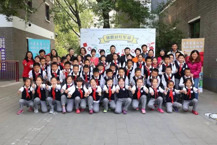 (图片说明:大型纪录片《长征》剧组主创与清华附小的同学们合影留念。) 总导演闫东以生动易懂的语言讲述了这部真实还原长征历史的大型纪录片创作幕后的故事及花絮,令学生们兴致盎然。