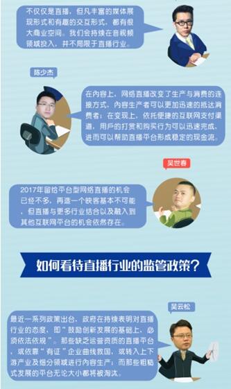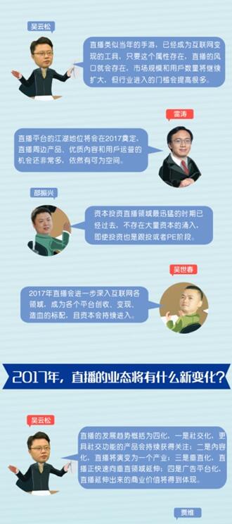 2016年,网络直播从一个普通的手机应用,变为充斥在年轻人休闲时光的热门话题,主播们从逼仄狭小的直播间走上大雅之堂,成为每场发布会不可或缺的角色,而资本市场对网络直播的态度更从最初的怀疑观望,发展到下半年的执着狂热。截止2016年10月,网络直播行业已孕育出欢聚时代、9158两家上市公司,此外,大大小小数百家平台正火热角力市场空间。在方正证券的预测中,2020年网络直播市场规模将达到600亿,中金在线的研报甚至认为2020年网络直播及周边行业将撬动千亿级资金。 2017年直播的风是否还继续吹,直播江湖是否依然刀光剑影?以下,资深直播行业专家吴云松、斗鱼直播创始人兼CEO陈少杰、陌陌副总裁贾维等多位行业大咖将对网络直播行业2017年存在的风口、可能的变化及面临的挑战进行深度解析。