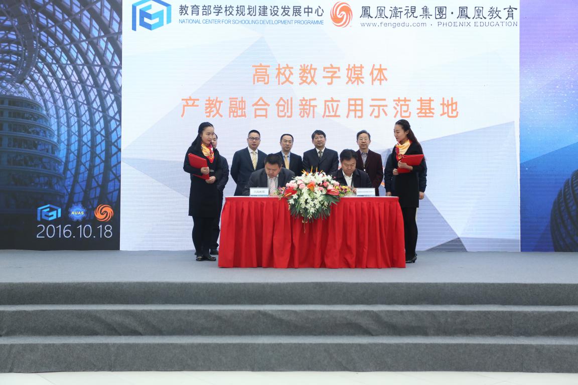 2016年10月18日,由教育部学校规划建设发展中心、应用技术大学(学院)联盟、凤凰卫视集团·凤凰教育联合主办的“数字媒体产教融合研讨会”在北京凤凰国际传媒中心举办。 教育部学校规划建设发展中心与凤凰卫视集团·凤凰教育联合签署“高校数字媒体产教融合创新应用示范基地”战略合作协议,正式启动“高校数字媒体产教融合创新应用示范基地”项目。