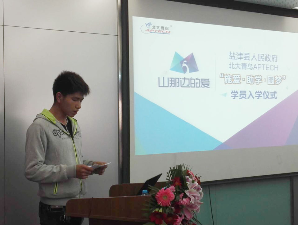 图示:贺盛同学在入学仪式上作为学员代表发言 你永远不知道下一秒会发生什么,机会和挑战并存,我们需要做的就是过好当下。在公益助学入学仪式上作为学员代表发言的贺盛也有着同样的感受。语言环境的改变需要自身做出极大的努力去适应,更何况是在大庭广众之下做演讲。犹记得在入学仪式上他说到:“作为来自贫困山区的学生来说,上学的艰难,求学的不易,父母的辛酸,每一样都深深烙在我们心坎里。而正是有了这些经历,体会过这些感受,我们才懂得要倍加珍惜这次改变自身命运的机会。从今以后我们将用更加坚强的意志苦练IT技能,坚持提高自身职业素质,为将来回报社会打下坚固的基础。”这次发言让贺同学懂得了改变才会进步,同时也突破了自己。 “我现在没别的想法,就想多看点书,多敲代码。” “我要努力,克服困难,多练打字” “课后他们都会给我讲我不懂的地方” …… 学习上的激情满怀,生活上无微不至的帮助,让吴章雄和贺盛很快的适应了在青鸟的新生活。正如贺盛所说:“电脑挺好玩的,但不是说玩游戏。”有了兴趣作为前提,加上北大青鸟在IT职业教育领域17年的深耕细作,有能力也有决心用一年半的时间磨砺提升他们成为一名优秀的软件工程师,用自己的双手改变命运,未来将会大有可为! |