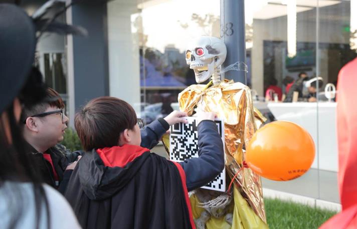 在“鬼怪”横行的万圣节,惊悚的吸血鬼伯爵、华美COS的妖艳贱货、天真卖萌的鬼马萝莉纷纷倾巢出动肆意捣蛋。乐次元影视会员也不甘落后,化身“乐圣天使”在乐视大厦和北京潮人聚集区三里屯,上演了最搞怪、最正宗的全新玩法,吸引帅哥美女、情侣档、炫酷萌娃、外国友人纷纷在街头“对暗号”,同时还在“漫”有引力--万圣节不鬼混专题页曝光了热门美综《中二少年吐槽大会》的部分内容,为乐次元影视会员打造了专属的乐圣节。 “街头对暗号”成为今年万圣节最in的搞怪玩法 10月28日,乐视大厦前惊现身披土豪金战甲的团宠骷髅大人, 引来大量路人围观,骷髅大人胸前贴有超大的二维码,分享与骷髅大人的合影,还有机会获得二维码背后的神秘大礼,好奇宝宝们纷纷上前一探究竟。