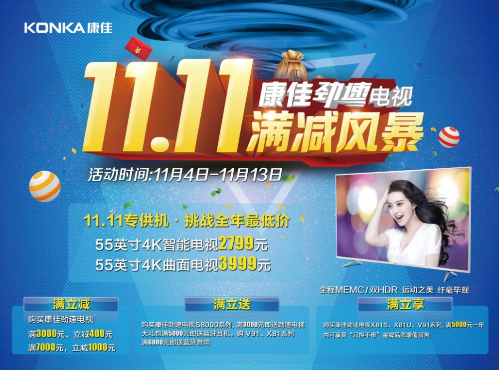 即使双十一还没到,不少商家已经陆续发起降价攻势,希望凭借这场全民惠战赢得更多消费者“芳心”。康佳电视认为与其让消费者在购物狂潮中拼得“狠”,不如让大家拼得“准”!毕竟买到实惠且品质有保证的高能产品,才叫收获到性价比高的宝,例如有“薄光溢彩”美称的康佳电视X81S系列,0.89超薄机身在早前已受到坊间不少关注,康佳电视也趁着此番好时机,让X81S系列与一众用户好好“惠”面。 虽说购物狂欢节源于网络,但随着用户逐渐认准节点,不少品牌近年在线下同样响应号召发起优惠,其实对比线上渠道,用户参与线下折扣活动购买到的产品在可靠性上会加分不少-毕竟能够摸到真材实料!尤其对于家电类产品,买前体验一番最好不过,因此康佳电视在今年双十一加入大促阵营,吹响购物狂欢节号角,于11月4日起至11月13日带来“劲速电视满减风暴”活动,其中康佳电视不仅以专供机大尺度挑战全年最低价,更振奋人心的是,活动期间购买康佳劲速电视系列还可享受最高立减1000元的优惠,入手指定机型X81S、X81U、V91系列更有机会获得“只换不修”金牌品质增值服务。同时,后续还有更多优惠亟待揭开神秘面纱……