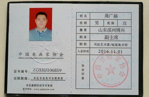 中国书画家协会消息,原中国书画 家协会理事周广福荣升中国书画家协会副主席兼山东分会副主席,据悉周广福,字:福之,1978年5月生,祖籍山东滨州博兴人,国家一级书法家,国家一级美术师,中国翰林院艺术家协会副主席;中国人民美术家协会 山东省分会副主席;香港国际华人书画家协会副秘书长;中国翰林院书画家协会副会长;中国收藏协会顾问;中国翰林书画院、山东省分院副院长;淄博市书法家协会会员;淄博市青年书法家协会会员;中国国际书法家协会会员。锦秋书画院副院长; 2013年周广福作品被香港举办‘2013中国百强书画家评选’获《2013中国百强书画家称号》。