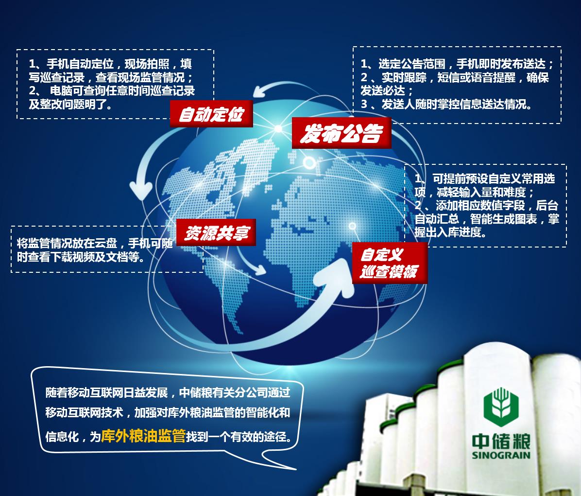 自动定位:分分钟看到现场监管实况 自动定位、现场拍照、填写记录,只要在手机上轻轻一按,几分钟就能搞定,监管科长和库领导通过手机立马就能看到现场的监管情况。打开电脑,可以查询任意时间段的全部或指定监管员的巡查记录,导出到excel,通过列表显示结果,巡查中发现的问题一目了然。 巡查模板:可以自定义的个性化服务 通过设置自定义巡查模板,可以让监管员根据模板填写相应的内容,轻松做好巡查工作。填写文本可以将常用选项预先设置好,填写时只要点击选择即可,减轻了输入量和输入的难度。如果想掌握出入库进度,只需在模板中添加相应的数值和关键词,填报后,后台会自动汇总,智能生成图表。 发布公告:再也不用担心错过重要信息了 通过发布公告功能,选定公告范围,通过手机,被公告人立马就能看到公告的内容。如果没看到或故意装着没看见,发送人还可以实时跟踪,通过短信或语音及时提醒。谁读了谁没读,发送人随时掌控,确保每一条公告发送必达,再也不会错过任何重要的信息。 资料共享:粮库监管资料也上“云” 通过资料共享功能,再也不用层层发送,只需放在云盘,用手机可以随时查看和下载。包括视频和各种文档。 移动互联技术的应用,不仅更方便、更快捷、更全面的实现监管,并且更有有效降低成本。分公司业务人员通过手机加入到各直属企业的虚拟监管团队,随时可以了解每个监管点的实际情况。据介绍,中储粮有关直属企业将在此基础上,拓展应用领域,实现全面预算管理和日常工作的智能化管理,不断提高协同和无纸化的移动办公水平。 |