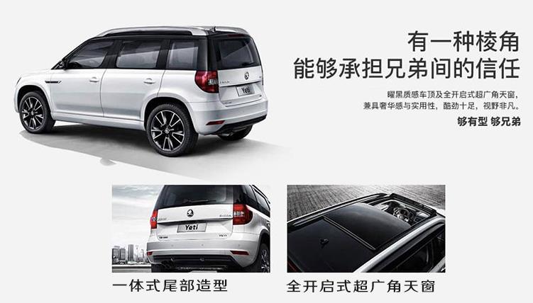 车享定制独享特惠 斯柯达Yeti车享兄弟版由斯柯达Yeti和上汽集团全生命周期O2O汽车电商平台——车享联合打造,在Yeti 280TSI 手自一体兄弟版的基础上,升级了8寸大屏导航、真皮座椅、多功能真皮方向盘、数字式无盲区后倒车雷达、前排侧面双安全气囊等7大配置,兼具硬朗个性的外观、强劲出众的性能和舒适尊贵的驾乘体验,大器非凡。