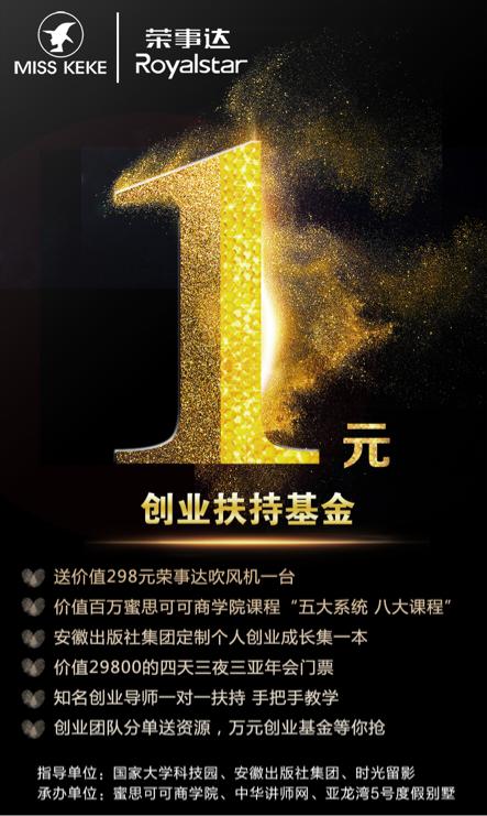 又或者,它会给你换来一次创业机会,也许是一千万,也许是一个团队,也许是一次人生新篇章的序幕!痴人说梦?骗局?可是,一块钱,你买不了吃亏,买不了上当!现在1元就可以加入1元创业基金! 让小编先来给你说个故事吧。在一个不知名的小城里,有一个不知名的小姑娘,年过二十,平凡普通,他的爸比不叫李刚,没有任何的家世背景,只有一家老小平凡甚至贫乏的生活。很多时候,连是否要放弃原则都没有选择的机会,就是这个淹没在万千大众里如此平凡的她,从口袋里只剩十元纸币,到一年赚到上亿元,她建起了自己的公司,拥有了千人团队。这不是天方夜谭!百度里,网络上,随处可查到她的创业故事,林志颖孟非等明星、各路网红都曾为了她的品牌年会站台助阵!徽商广播、cctv等各大权威媒体都有过她的专访报道。尽管她现在食有肉,出有车,挥杆高尔夫球场,高等学府里学MBA,但过往的酸甜苦辣仍历历在目,她依然清楚记得艰难岁月里花的每一分钱,走过的每一条路,遇到的每一个坎。于是,她想,让每一个和她一样曾经普通平凡却不安现状,想过的更好的人们,打造一个活出自己的机会。