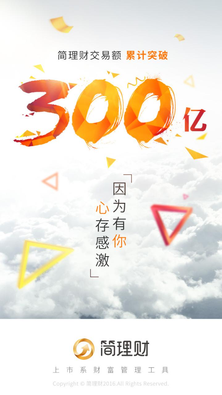 2016年11月25日,对于简理财又是一个里程碑。这天,它的累计成交额达到了300亿,完成了在2016年第3次突破百亿大关,成为互金行业少有的指数级成长企业。