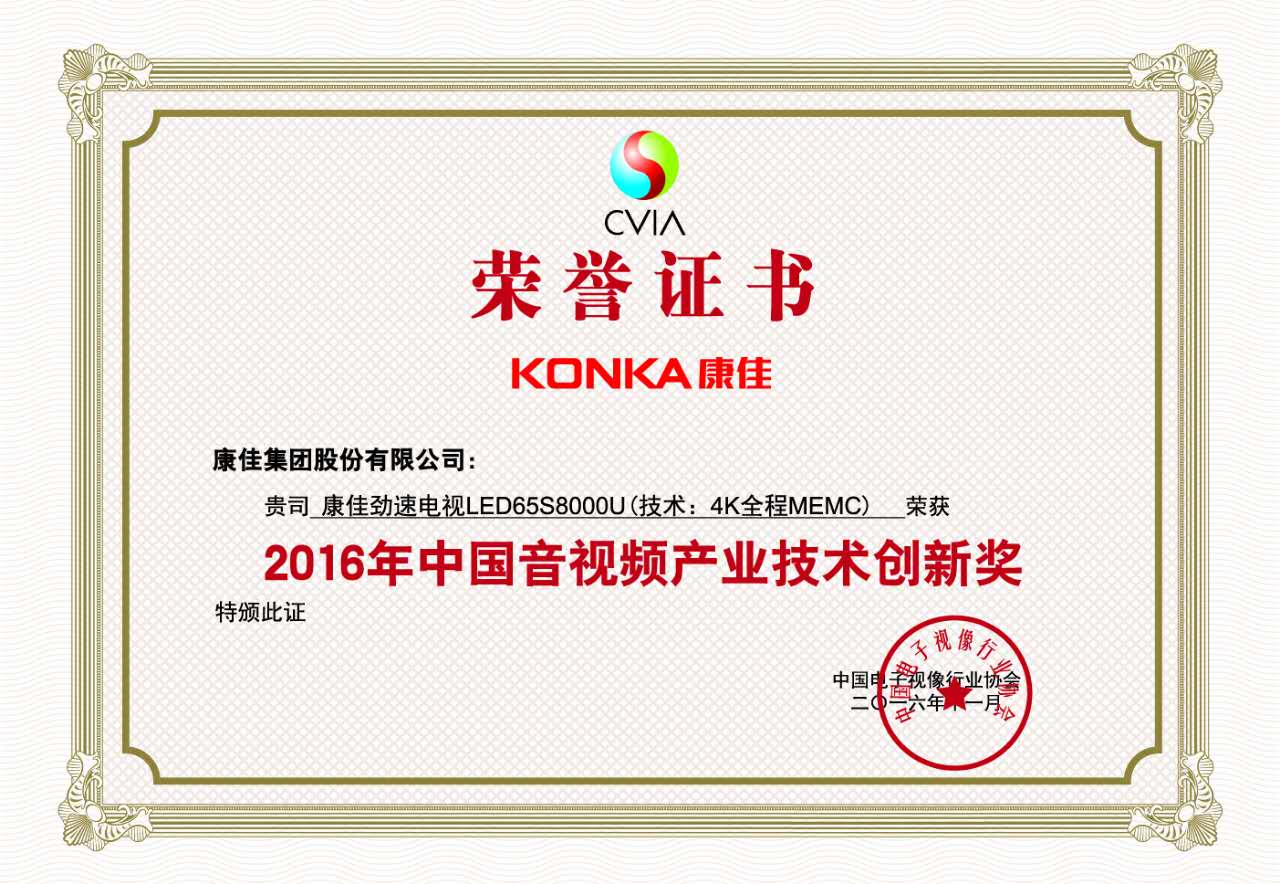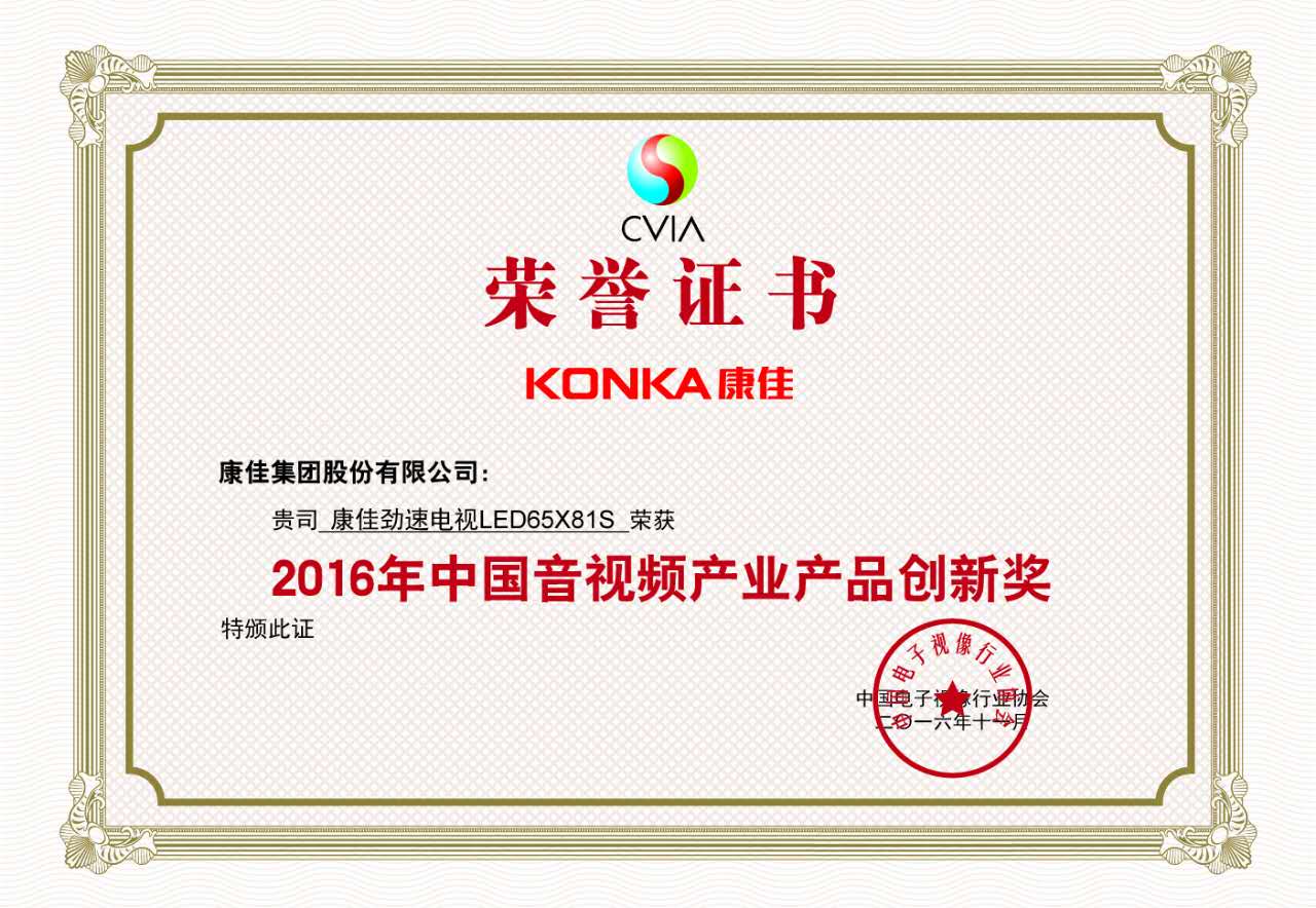 11月24日,由中国电子视像行业协会主办的2016第十二届中国音视频产业技术与应用趋势论坛(AVF)于北京隆重举行。作为我国音视频产业规模最大、级别最高的技术与应用交流盛会,本次论坛主题定为“聚焦新趋势,创造新未来”,意在紧跟行业发展趋势,以创新预见行业未来。 同时,中国音视频产业技术与应用趋势论坛在今年继续为对音视频行业有一定贡献的企业颁发奖项。值得注意的是,康佳电视在本次论坛中凭借劲速电视LED65S8000U及LED65X81S分别揽下2016年中国音频产业技术创新奖、2016年中国音视频产业产品创新奖。