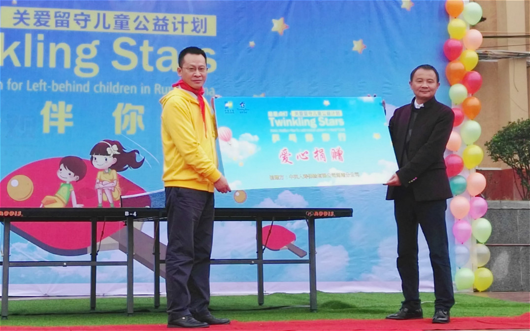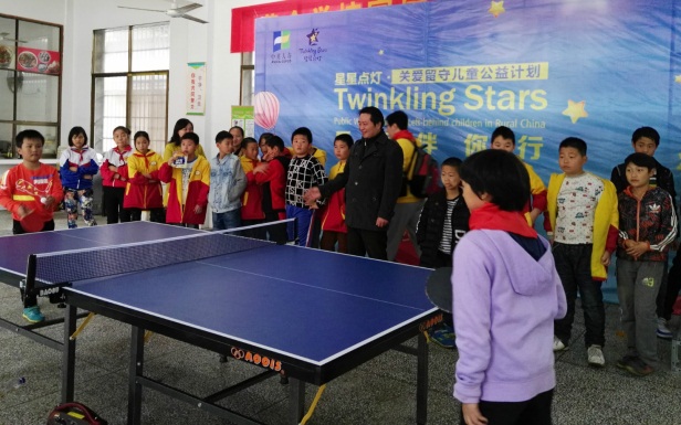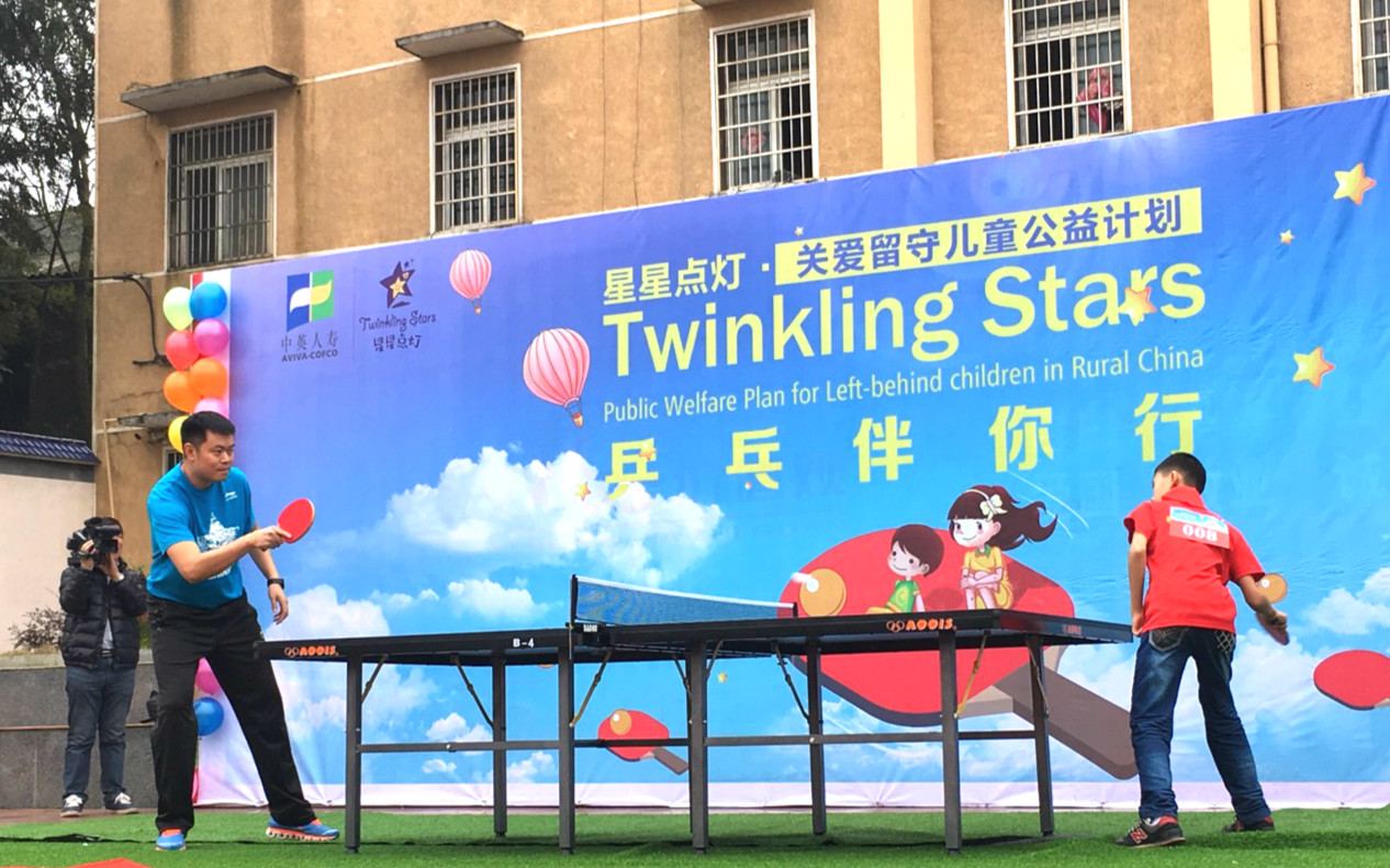 中英人寿副总裁罗国兴代表“星星点灯”项目组致辞 世界冠军侯英超通过经验分享,向留守儿童介绍乒乓运动的魅力 “星星点灯 •关爱留守儿童公益计划”是中英人寿保险有限公司借鉴英方股东英杰华集团(AVIVA)“Street To School”(从街道重返校园计划)的运作经验,对留守儿童进行关爱的一项大型公益活动。截至2015年,6年来在12个省份的乡镇中心小学援建了25间关爱小屋,援助了50所农村小学,动员1200多名社会志愿者参与其中,活动覆盖10万名留守儿童。