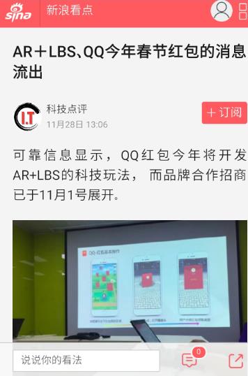 昨日,新浪新闻爆出一条消息,称QQ红包今年春节将会玩科技红包,虽然只有短短的几句话,但是能够猜测出来,今年QQ红包将玩转AR+LBS。随之一起流出的还有另一个信息——QQ红包2017年春节品牌合作招商已经于11月1日展开。短短几个小时,得到消息的各大品牌商纷纷摩拳擦掌,瞄准为数不少的黄金席位。