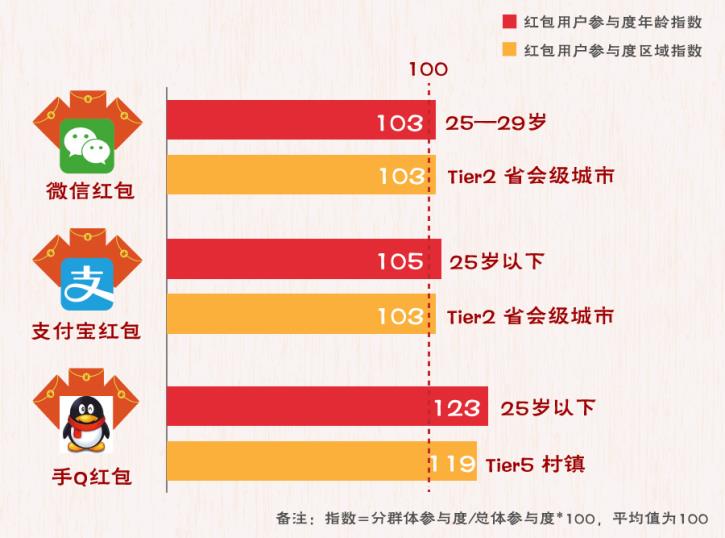 QQ红包已成最大黑马 自从2015年高调杀入春节红包,QQ红包小试牛刀便成绩斐然。 翻看微信、支付宝、QQ红包的猴年除夕夜数据:全球共有4.2亿人次收发微信红包,除夕当天红包收发总量为80.8亿个,峰值每秒40.9万个。支付宝总参人次为3245亿次,有30%的用户选择将福卡送给了家人。 在这场激烈的“三国杀”中,QQ作为后来者,红包收发总量达42亿元,对比2015年增长超过5倍,速度远远超过微信和支付宝。其中,参与“刷一刷”QQ红包的总用户数为3.08亿,共刷1894亿次,各项数据均创历史新高,当之无愧的成为春节红包大战中的最大黑马。 不仅如此,QQ红包还拥有对手不可比拟的优势——超8亿年轻用户基础,因为用户的“年轻化”特质,玩法也更加灵活大胆。