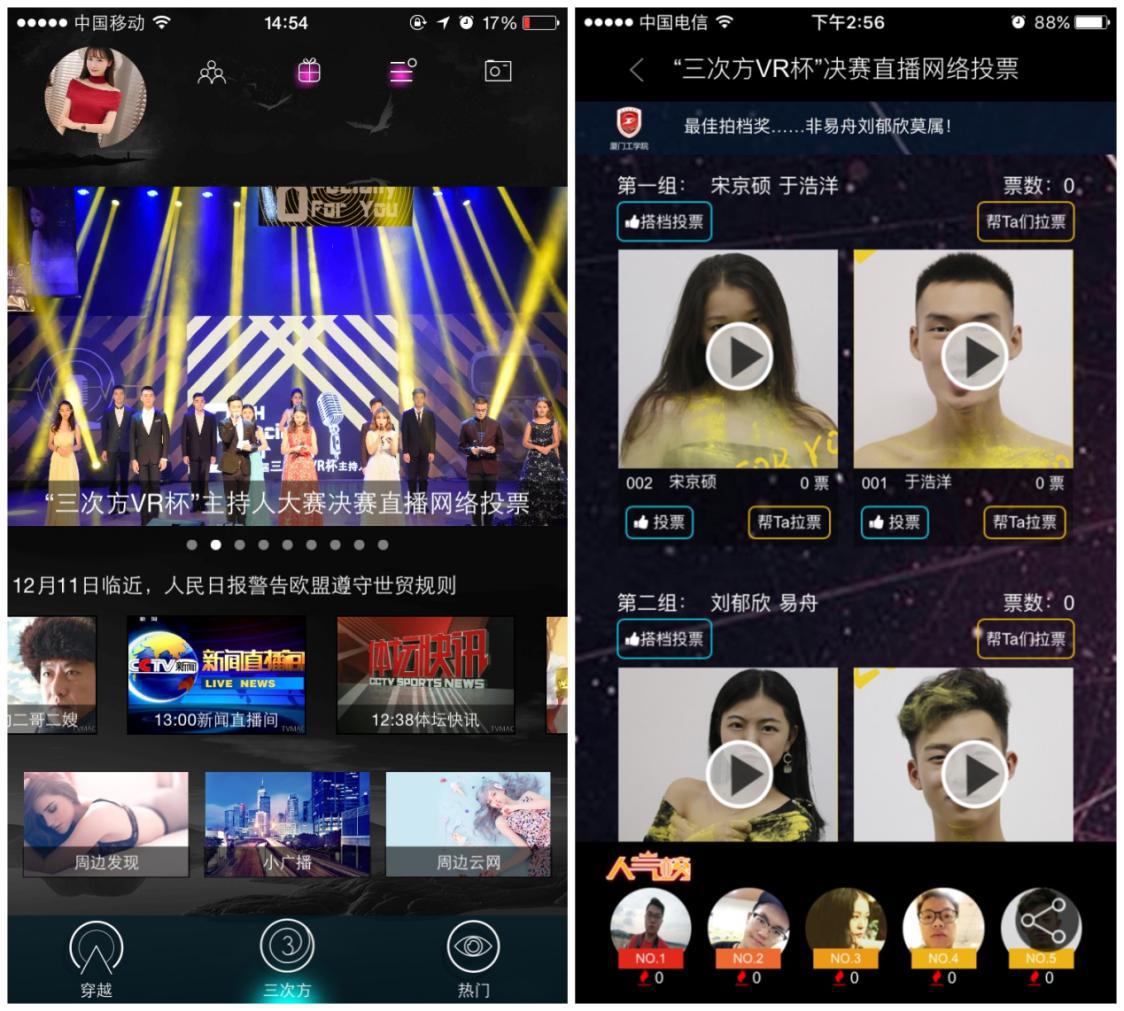 值得一提的是,此次比赛选手的参赛作品也较之以前更有创意。尤其是最佳人气奖选手刘妍希与其搭档联袂打造的《我好方啊》电视购物节目,用无厘头、夸张、搞笑又充满创意的方式,将触信科技“三次方VR魔镜”的优势一展无遗,更是将冷冰冰的高科技产品变得更为生活化,更接地气,让在场嘉宾都表现出了对VR魔镜的兴趣和关注。 激情互动 VR让世界更逼真 场上,选手们拼的是舌吐莲花;场下,观众们的热情也被彻底点燃。据了解,比赛现场一片热闹景象。观众们在为选手激烈呐喊助威之余,还积极参与摇一摇互动抽奖游戏。游戏由赞助方全力支持,现场观众通过关注“三次方”公众号参与摇一摇游戏,摇的最多的前三名将获得由触信科技提供的“三次方”VR魔镜一副。 值得一提的是,触信科技除了赞助比赛所需奖品之外,同时还将公司自主研发的智能投票系统应用到了主持人大赛的奖项评选中。该系统可以有效防止选手们的刷票作弊等问题,同时观众还可以在这投票系统上观看选手们的VR宣传视频。 VR带你亲临现场 决赛直播网络投票正式开启