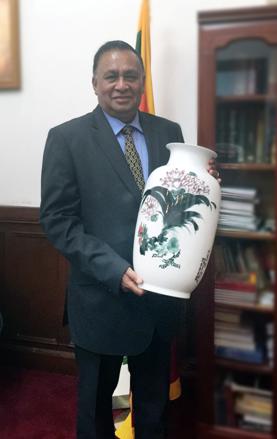 清华大学美术学院李砚祖教授首创出万千窑变工艺,开创了中国瓷器的新里程碑,被誉为窑变之父。在生肖鸡年到来之际,李砚祖教授首次创作出窑变生肖鸡作品,被定为外交国礼瓷。 中国与斯里兰卡的交往历史悠久,自五十年代两国建立外交关系后,两国便开始了真诚互助、世代友好的全面合作伙伴关系。如今外交部为促进两国文化交流,于10月18日将李砚祖教授的窑变生肖鸡赠送给斯里兰卡驻华大使卡鲁纳塞纳·科迪图瓦库。