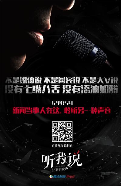 2016年舆论喧嚣,从老虎咬人、王宝强离婚到人机大战等一桩桩热点新闻,当事人和网络舆论的对峙让事件变得扭曲。新闻媒体如何多元呈现事实、网民如何了解事件背后的真相,成为互联网时代下的一大课题。 临近年关,基于对年度热门新闻事件的梳理,12月15日腾讯新闻将重磅推出《听我说》特别节目,并邀请到社会民生、娱乐、网红、人工智能等相关热门新闻当事人,以全程直播的形式对外发声,讲述事件背后未曾发声的另一面,多维呈现事实。