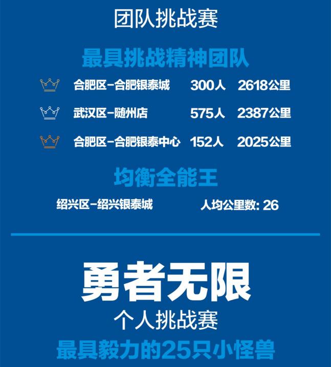 本次活动设“个人挑战赛”和“团队挑战赛”,个人赛鼓励员工独立参赛,根据规定时间内跑步的总里程设立排名,前 25 名将获得万金难求的直通杭马名额,并成为“杭马银泰跑团”成员。团体赛以门店、集团职能部门、项目公司为单位,需要全员协作,在规定时间内完成11,160公里的总目标,以完成时间的先后顺序依次排列,团队前三名获得“银泰2016最具挑战精神团队”殊荣。