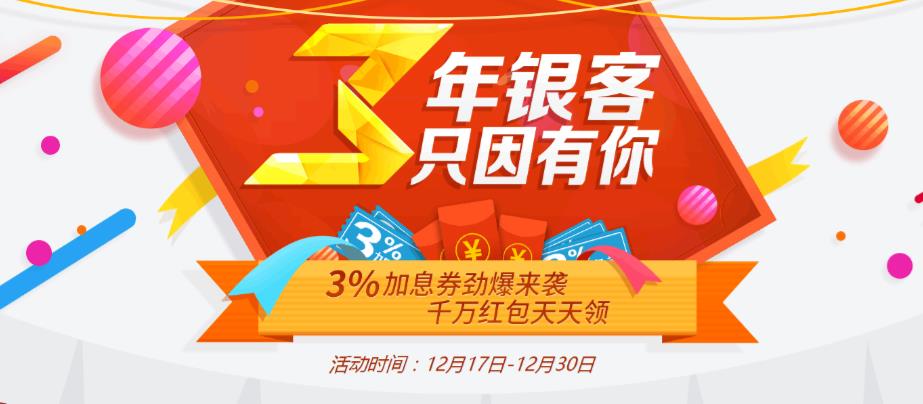 2016年12月是国内知名的互联网金融信息服务平台银客理财上线三周年的日子。为了感谢广大用户三年以来对银客理财的支持和信任,银客理财开启了“3年银客 只因有你——3%加息券劲爆来袭 千万红包天天领”为主题的感恩回馈活动,在活动期间3%加息券、红包不断档,惊喜不停。