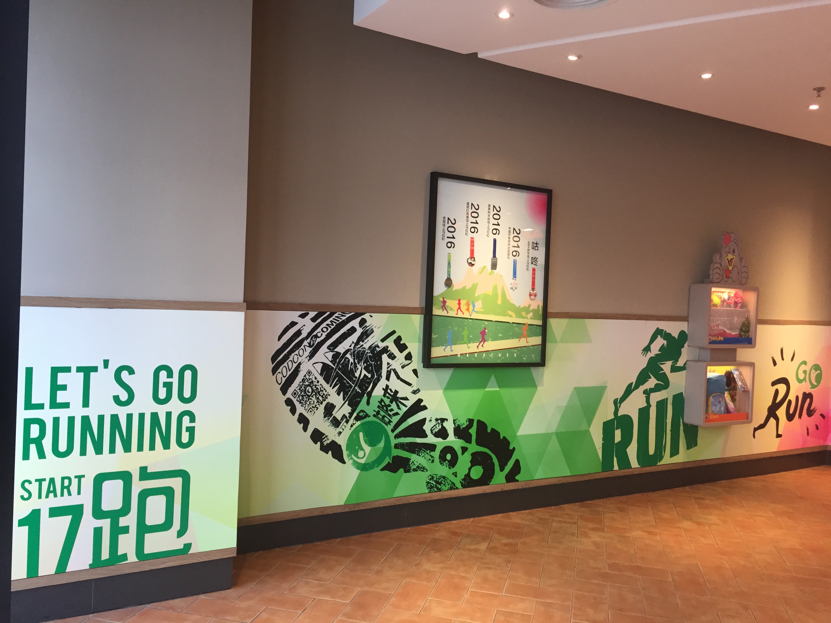 跑步主题餐厅 马拉松奖牌的海洋 咕咚与肯德基的首家跑步主题餐厅选在深圳湾体育中心,立意非常明确——为运动人群“加油”,提升运动体验。餐厅四处挂满了咕咚各站线上马拉松比赛的奖牌,加上生动的跑步元素装饰,不管白天晚上,全程引发跑步群众、射箭群众、骑行群众、路过群众的围观,还有顾客争相询问“哪里可以买到”“吃肯德基送奖牌吗”等问题,不少天真可掬的孩子一度现场要求“试戴”,整个餐厅的气氛变得热烈欢快,让人充满“迈开腿”的冲动。