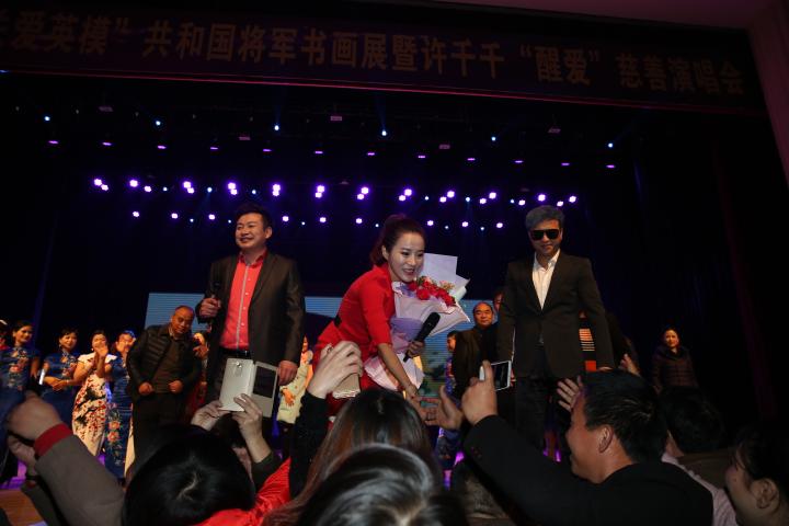 昨晚由华人频道、中国广播艺术网、世界华人联合大会共同主办,江西华人骑云文化发展股份有限公司、于都同喜演艺有限公司承办的“为爱醒来、关爱英模”共和国将军书画展暨许千千“醒爱”慈善演唱会走进长征源于都,在于都艺术中心顺利开唱! 原北京军区政委谷善庆上将、空军装备部原副部长兼总工程师申良启将军,将军部长书画院秘书长卓钇辰女士、于都县原政协副主席谢赟先生、北京中天翰墨书画院院长叶伦汉先 生,华人频道江西总编周和平先生、宾利集团亚洲总裁杨满生先生受邀到场观看!