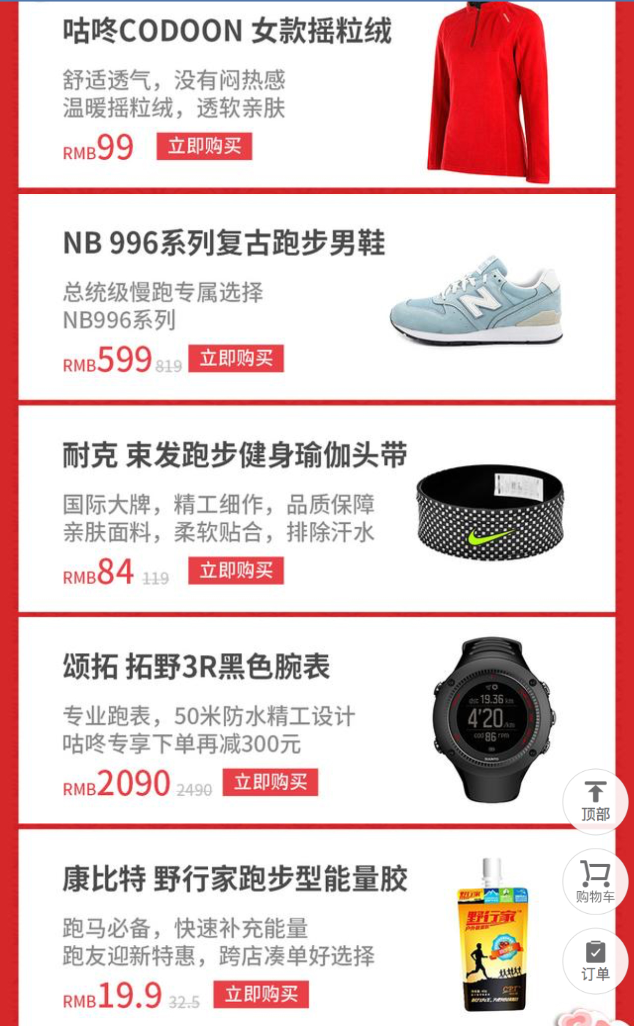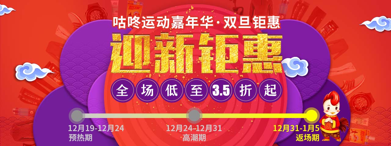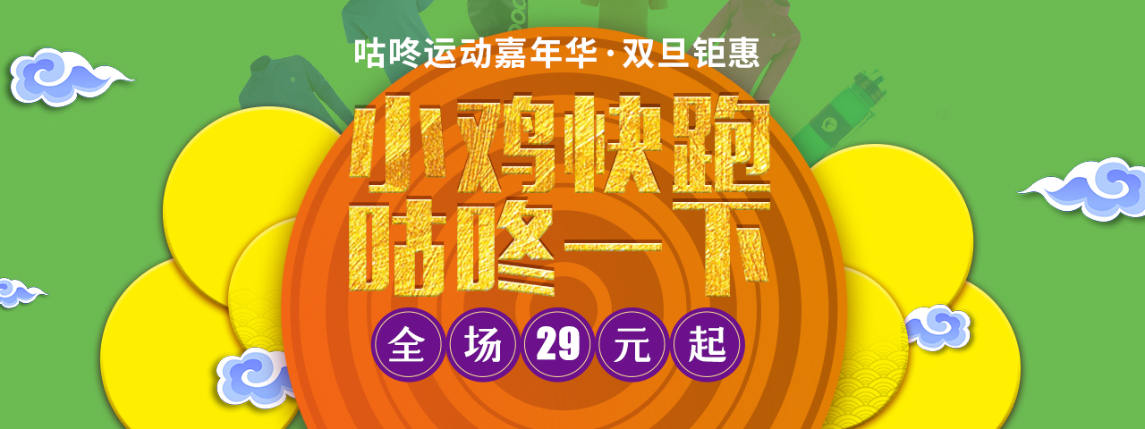 经过了圣诞前后的火爆销售,元旦期间咕咚电商给每一位咚粉带来一浪又一浪的返场优惠。其中三大会场引领线上购,分别是: 小鸡快跑(全场29元起); 迎新钜惠(全场低至3.5折起); 年度盘点(咕咚电商大数据)。 双旦钜惠是一场运动主题的狂欢,鸡年消费,更要“机智”,才能享受更多实惠。咕咚自有品牌的运动T恤、摇粒半开衫、专业运动卫裤、防风夹克,在过去的一年里十分畅销,而国际大牌跑鞋、智能可穿戴运动设备更是运动高科技的集中体现,帮助咚粉们“武装到牙齿”,以运动迎来2017的好彩头。