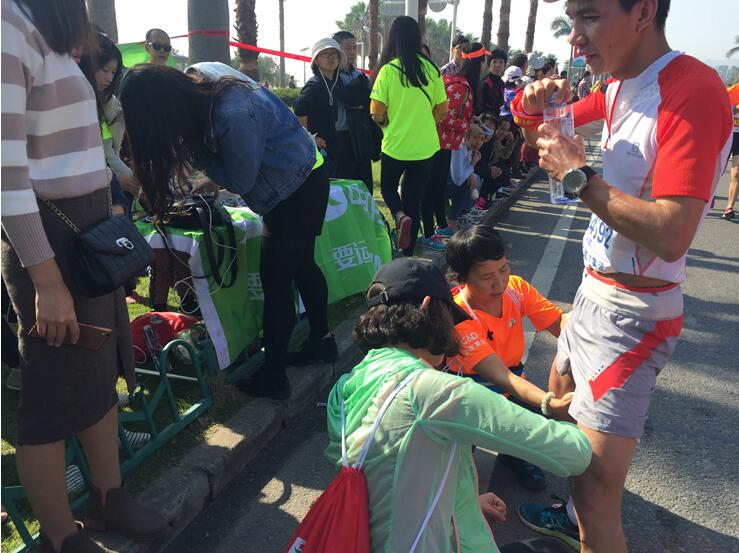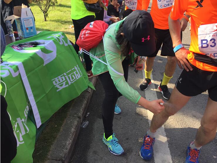 除了能量胶、水和紧急按摩,医疗喷雾剂也是必不可少。在“咕咚壹厦”的现场聚会上,紧急处置是最看重的知识传播环节,比赛中轻微的肌肉痉挛和疲劳引起的暂时性抽筋,可以接受紧急处置,而几条必须强制遵守的措施是: 出现难以忍受、长时间难以恢复的极点状态; 出现突发的眼前发黑、窒息感、冷汗等虚脱症状; 出现突发性腹痛、严重的小腿抽筋、突发肌肉拉伤、踝关节扭伤; 参赛者应立刻退出比赛,接受治疗或向志愿者求救。这需要志愿者有足够丰富的应对经验,而这也是每一站跑团聚会循序渐进普及和辅导的重点内容。