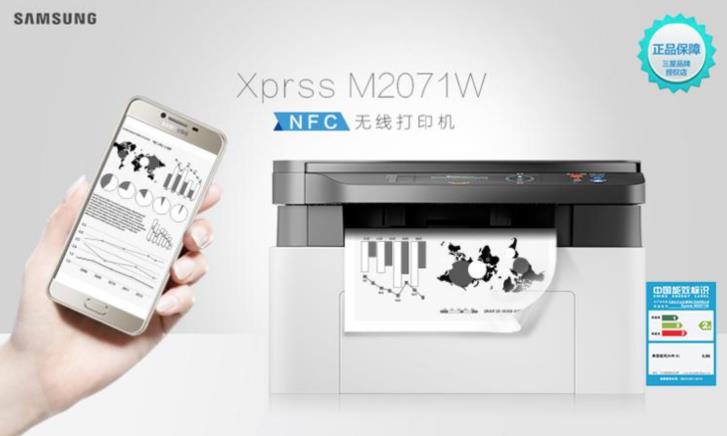 三星SL-M2071W采用了独具三星风格的黑白配色,小巧的外观设计不仅美观时尚更节省了储放空间,作为体积最小的支持NFC功能的黑白一体机,三星SL-M2071W支持打印、复印和扫描等打印设备的主流功能,同时打印分辨率高达1200 x 1200dpi,可输出专业的打印品质。三星SL-M2071W拥有NFC(近场通讯)WIFI直连等技术,其广泛的兼容性为办公效率的提升带来了无限可能,使用时,只需将移动设备轻触打印机上的NFC图标,即可完成连接并打印移动设备上的制定内容,十分便捷。同时,可配合三星打印智能操作中心的Send Anywhere应用程序,扫描后可以将内容直接发送到手机,为移动办公提供了更多的便利条件。