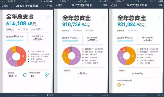 1月4日,和往年一样,蚂蚁金服旗下支付宝发布了2016年的中国人全民账单,在刚刚过去的2016年,4.5亿实名用户使用了支付宝。通过对上述海量用户行为进行了计算和分析,我们可以看到:移动互联网已经成为中国人生活方式的一部分,4.5亿消费者过去一年71%的支付笔数发生在移动端,超10亿人次使用“指尖上的公共服务”;中国“千禧一代”80后、90后已经成为中国经济的主流力量,并将影响未来十年的经济格局,比如80后人均支付金额已超过12万元,90后使用移动支付更是高达91%;同时,4.5亿中国消费者开始呈现出与十年前完全不一样的生活形态。