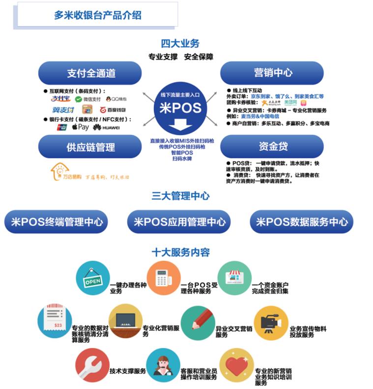 多米收单台也是各种业务的数据汇集中心,一站式完成对账、清分的工作,各类渠道、各种营销形式、各家门店数据、费用明细一目了然,大大降低了管理难度。另外米POS管理系统是专业的POS管理服务后台,使布放在不同门店、渠道的业务都可以实时掌控。 不仅有内容丰富的软件管理还有强大的硬件产品,国际最高等级PCI4.1安全认证的N900终端,通过国内国际多项安全受理认证。完美承载多米收银台业务,满足不同层次客户需求,利用米POS应用商店还可叠加第三方应用。另外还可以支持与商户收银系统的无缝对接,可定制报表,满足个性化需求。 还有更多增值服务,以交易流水作为贷款依据的新型互联网金融业务—POS贷,使企业的资金来源有了新的通路,让企业快速发展。
