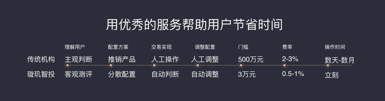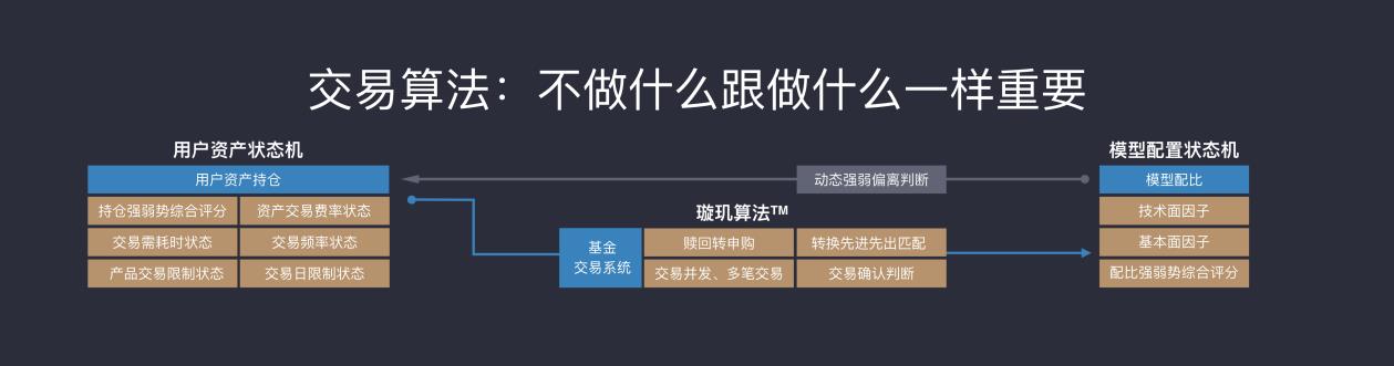 简单服务背后的复杂算法 璇玑进入这个领域,是看到了行业的巨大发展前景。在美国除了创业公司以外,传统的巨头都已经纷纷进入,比如全球排名第一和第二的资产管理公司贝莱德和 Vanguard、私人银行的巨头瑞银,华尔街老牌的银行花旗和高盛。在国内这个领域更是处在早期,据行业的预测,在三年内就将达到 5 万亿左右的规模。 以我们自己的 C 端产品——璇玑智投为例,一个标准的智能投顾运作流程分为四步: 通过人机交互的形式了解客户的基本属性和投资需求; 提出针对客户的投资组合; 在客户确认后,为客户实时完成投资交易; 在后续市场变化中,实时的监测客户的投资情况,及时做出相应的调整。 在看似简单的环节后面,蕴含着许多金融工程的应用。 首先,智能投顾需要一个靠谱的投资逻辑和模型。智能投顾应用的是大类资产配置的理论,但是前提是在于有强大而实时的计算能力来构建并且不断的演进投资模型。璇玑算法引入了机器学习的部分,在两个层面做了提高。第一他使得模型不但能够处理结构化的数据如连续的价格曲线等,也能够处理非结构化的数据,比如一些技术指标;从而增加了数据的诠释能力。 第二,模型的不断的被验证的结果会成为下一次判断的数据样本和依据,而模型本身也在不断进化和演变之中。我们每天都需要进行 43 亿次的循环计算学习,称为 loop,而每 6 万次 loop,我们才能得到一次 converge,也就是收敛。在这样的大规模的计算中,模型在不断的进步,使得我们今天对于国内市场的拟合达到了 60% 以上,对于海外市场的拟合达到 70% 以上。 第三,在做出大类资产的模型配比后,我们还需要适配相应的金融产品。在这里我们和主流的金融机构不太一样,我们不追寻主动投资能力,原因就在于主动的投资能力是非常稀缺的。人人都说自己是巴菲特,但是巴菲特只是少数,而且不可能为每个人服务。我们认为,重要的不是去寻找巴菲特,而是找到一组适合你的模型的产品。在这个逻辑下,我们在市场上的 4000 多个产品经过多维的分析后,每个投资人的产品库最多只需要 60 个候选产品就足够了。