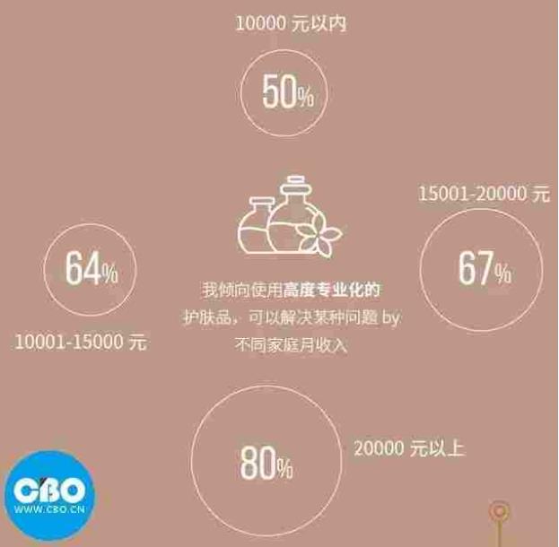 品牌定位是指让品牌在消费者心中占据有利位置,使品牌成为某个类别或某种特性的代表品牌。当消费者产生相关需求时,会将定位品牌作为首选。护肤品的定位伴随护肤品营销的整个过程,并不断支持护肤品市场营销的发展。CBO数据显示,67%女性被访者表示倾向使用高度专业化的护肤品,可以解决某种问题。家庭收入越高,越倾向使用高度专业化的护肤品。因此,要想成功地营销护肤品,必须精准定位消费人群,做出更加个性化的营销策略组合,以争取到更多的细分消费者市场。诸多产品都在极力寻找自己的方向,期望在众多同质化品类中找到自我。
