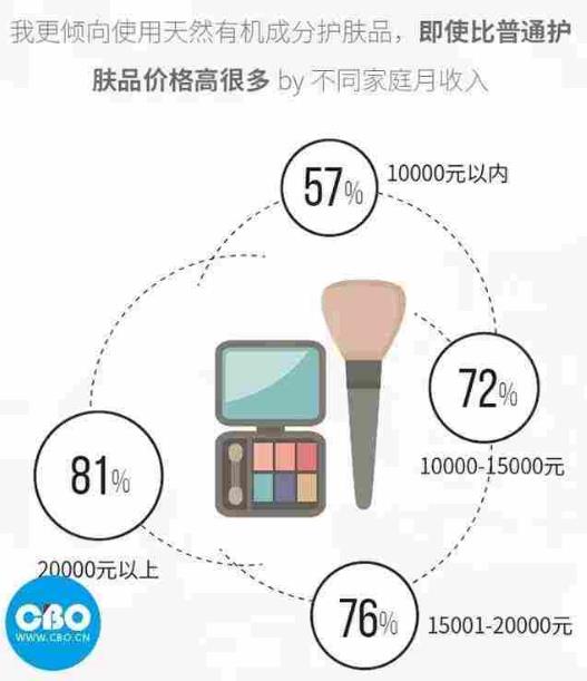 随着新生代消费人群的崛起,市场需求已经发生了根本性转变。80后90后新生代消费人群成为主力消费人群,社会化网络媒体逐渐成为主流媒体,消费人群被细分。随着大众环保健康意识的提升,越来越多的消费者开始从消费源头上注重健康、抵制污染。CBO调研显示,72%的女性被访者表示在使用护肤品之前必须知道成分构成。74%的女性被访者表示,更倾向使用天然有机成分的护肤品,即使其价格比普通护肤品高很多。而家庭月收入越高,消费者对天然有机成分护肤品的需求越强烈。以“尊重自然环境、追求安全单纯以及重视皮肤健康”为宗旨的有机护肤品,似乎在一夜之间成为全球女性护肤的不二选择。