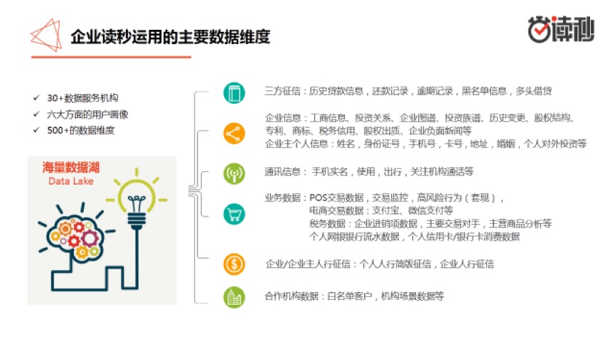 从数据我们也可以看出银行征信的难度:目前央行的征信系统虽然覆盖了 8 亿人,但真正和银行有信贷关系的只有 3 亿人。也就是说,在中国 13 亿人口里,有银行信贷记录的人,占比不足 25%,二三线城市的小微商户常常属于征信并未覆盖的人群。 很多商户借贷需求难得到满足。 除了向银行贷款,还有哪些贷款方式? 除了银行,还有很多可以提供贷款的来源: • 民间私人借贷。众所周知这种方式有风险高,利率高,不稳定因素过多等弊端。 • 规模较小的当地银行以及一些民营银行。这一类相对于大银行来说对小微企业的友好度更高,但是同样也面临申请过程复杂,额度不足等问题。 另外,互联网金融的加入也让小微企业贷款有了新的选择,最重要的是,信贷也可以有更好的用户体验了。 这里面也分几类: • BATJ 推出的信贷产品。 其实姜玉凤逐一试过这几类产品,其中阿里、京东还是以淘宝和京东店铺的“白名单”制度为主,姜玉凤虽然也开了网店,但网店流水并不太大,不在白名单之列;她又尝试了面向个人的微粒贷、借呗,贷款额度太低,难以满足资金周转需求。 • 互联网金融平台。市场上有不少公司,将企业主看待成个人,采用个贷的方式来做企业经营贷。相比于BAT电商们来说,这些公司能够覆盖足够多的人群,一定程度上降低了贷款门槛。但这也带来了风险——用个人贷的风控方法,为小微企业主做风控,忽略了企业经营中的一些风险因素和指标,在短期内资产增长很快,但长期来看,都会发生较大的损失风险。 • 智能信贷。这个领域是目前小微信贷里的后期之秀,最有代表性的是读秒旗下的小微企业信贷产品「企业读秒」,用户在3分钟内完成申请,15分钟得到授信结果,75%的可以完成当天到款。这对于需要快速获得贷款的小企业主们来说,无疑带来了极大的便利。
