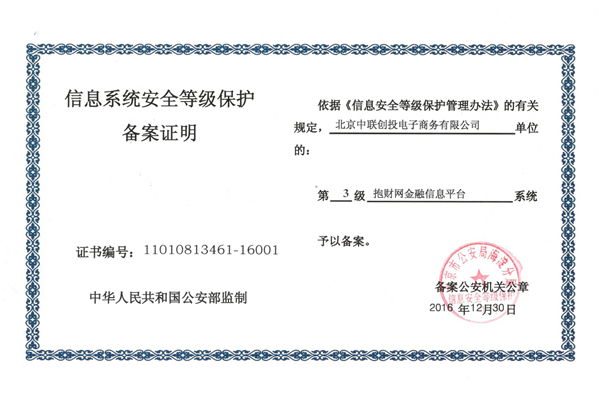 近日,上市系互金平台抱财网获得了由国家公安部门颁发认证的“信息系统安全等级保护”三级备案证明,成为业内首批完成网络信息安全第三级认证的互联网金融平台之一。这意味着抱财网在网络与信息安全工作方面获得认可,将为投资者提供更加安全优质的服务。