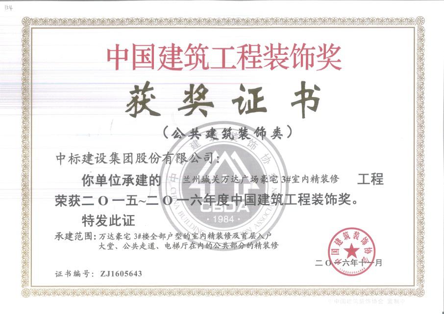 新三板挂牌企业中标集团(NEEQ:833014)作为国内最具影响力的建筑装饰企业之一,历来坚持“以设计和工程质量取胜”的经营理念,并取得了良好的市场及社会认同。至今,公司建设的项目已累计获得了鲁班奖1项,全国建筑工程装饰奖13项,国家优质工程奖1项,除此之外,还屡屡荣获北京市优质工程奖、福建省装饰闽江杯、陕西省优质工程奖、甘肃省优质飞天杯、河北省优质工程安济杯、湖北省优质工程楚天杯等多个地方性工程质量奖项。在刚刚过去的2016年,中标集团荣获的优质工程奖项就多达20项,其中包括中国建筑工程装饰奖5项,地方性工程质量奖15项。