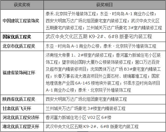 随着精神方面的需求不断增加以及审美能力的不断提高,人们对建筑装饰的设计水平和工程质量越发重视。对于建筑装饰行业的企业来说,企业的设计能力和工程质量保障能力不仅关系到工程的适用性和建设项目的投资效果,而且在企业的市场开拓和品牌建设过程中的扮演着越来越重要的作用。 有业内人士表示,在建筑装饰行业,企业承接项目的获奖能力至关重要。因为建筑工程获得鲁班奖、全国建筑工程装饰奖、省级优质工程奖等重量级奖项意味着其工程质量和设计水平得到了权威机构认可,建筑产品也更容易被市场接受,并有助提升建筑产品的品牌和市场价值。基于这一点,有实力的甲方往往倾向于和设计、施工能力强,有获得优质工程奖项潜力的建筑装饰企业合作,因此,获奖能力强的建筑装饰企业在市场开拓方面往往更具优势。 新三板挂牌企业中标集团(NEEQ:833014)作为国内最具影响力的建筑装饰企业之一,历来坚持“以设计和工程质量取胜”的经营理念,并取得了良好的市场及社会认同。至今,公司建设的项目已累计获得了鲁班奖1项,全国建筑工程装饰奖13项,国家优质工程奖1项,除此之外,还屡屡荣获北京市优质工程奖、福建省装饰闽江杯、陕西省优质工程奖、甘肃省优质飞天杯、河北省优质工程安济杯、湖北省优质工程楚天杯等多个地方性工程质量奖项。在刚刚过去的2016年,中标集团荣获的优质工程奖项就多达20项,其中包括中国建筑工程装饰奖5项,地方性工程质量奖15项。 表: 中标集团2016年获得的优质工程奖项